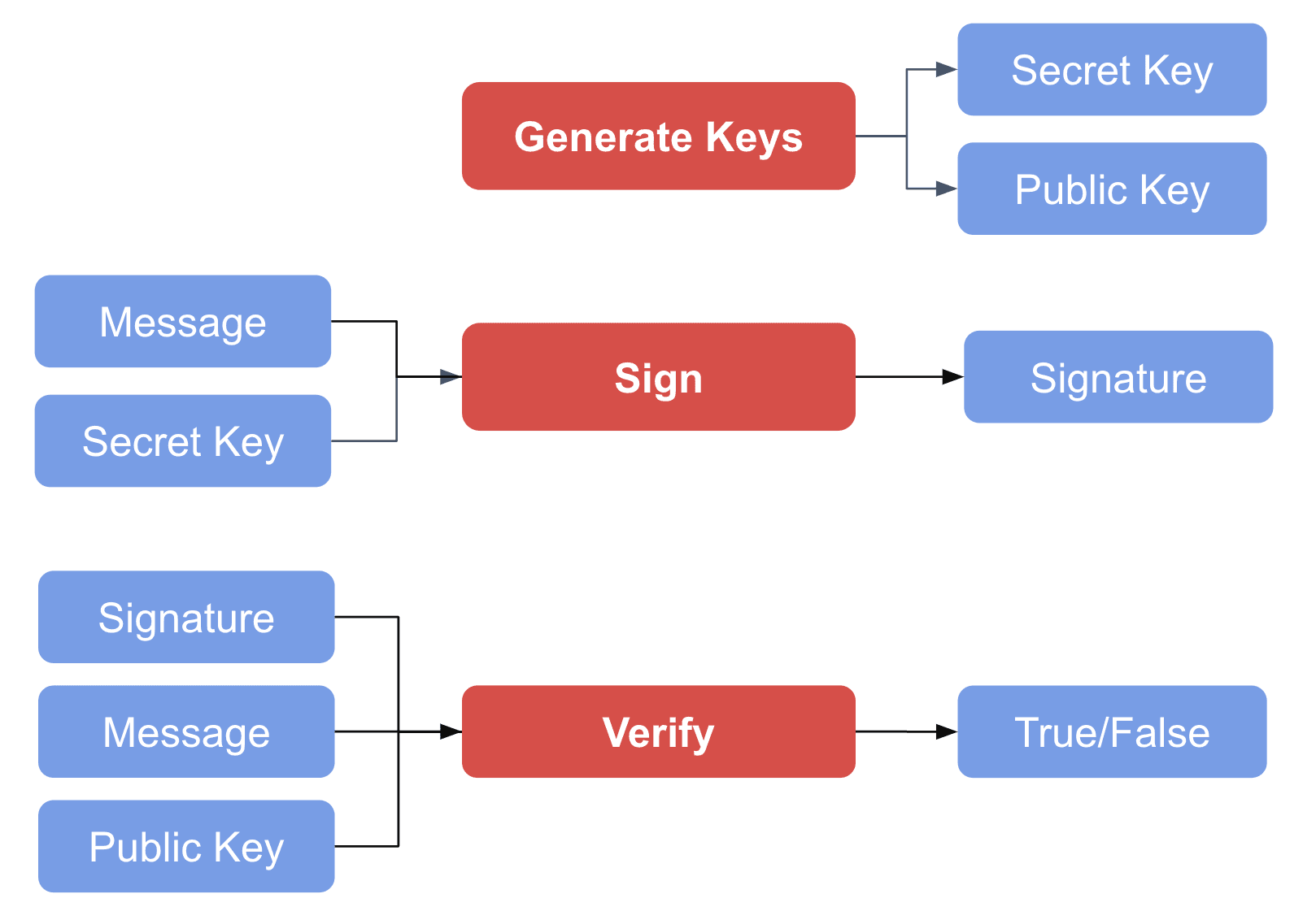 - Verify(Message, Signature, Public Key) => Valid/Invalid: This algorithm is used to verify the authenticity of a received message with the public key of the sender and its associated signature. The result is that the signature is either valid or invalid for the given private key.